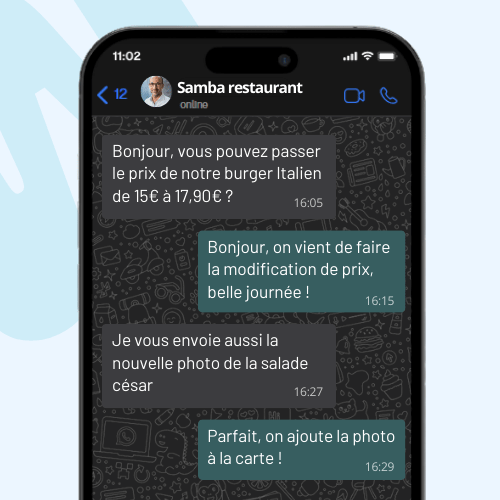 Ci comunichi le modifiche da apportare al tuo menù (modifiche di prezzo, aggiunta di piatti, eliminazione di piatti, ecc.) e noi le applicheremo entro 48-72 ore.